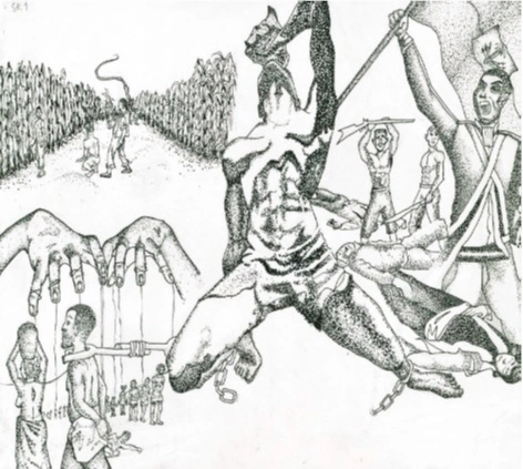 Bien qu'il se soit libéré de ses entraves physiques, il reste enchaîné mentalement ; Oubliée toute sa rage d'exploité, toutes ses péripéties, sa promesse de "vivre libre ou mourir", il n'est maintenant que le pantin du blanc, devant lequel il s'aplatit au son de la voix, auquel il livre son pays, sa patrie, ses semblables. Meurtres, vols et viols, à la seule demande de celui-ci, il est prêt à tout. Il est dépendant du blanc sans lequel il ne peut rien faire, il est incapable de réfléchir de par lui-même. Tous les aspects de sa vie sont contrôlés par celui qui jadis le traitait comme un bien meuble.